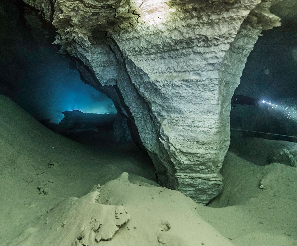 An mehreren Stellen der Ordynina-Höhle gibt es trockene Räume, in denen Sie frei auftauchen und sich auf dem Felsen entspannen können. Wenn der Wasserstand im Kungur-Fluss neben der Ordynska-Höhle fällt, geschieht dies auch in der Höhle. Dann werden die an der Decke aufgehängten Felsblöcke schwer, sie brechen ab und fallen zu Boden. Meistens geschieht es im Frühling und Herbst. Auf diese Weise lebt die Höhle noch immer und ihre Landschaft ändert sich jedes Jahr.