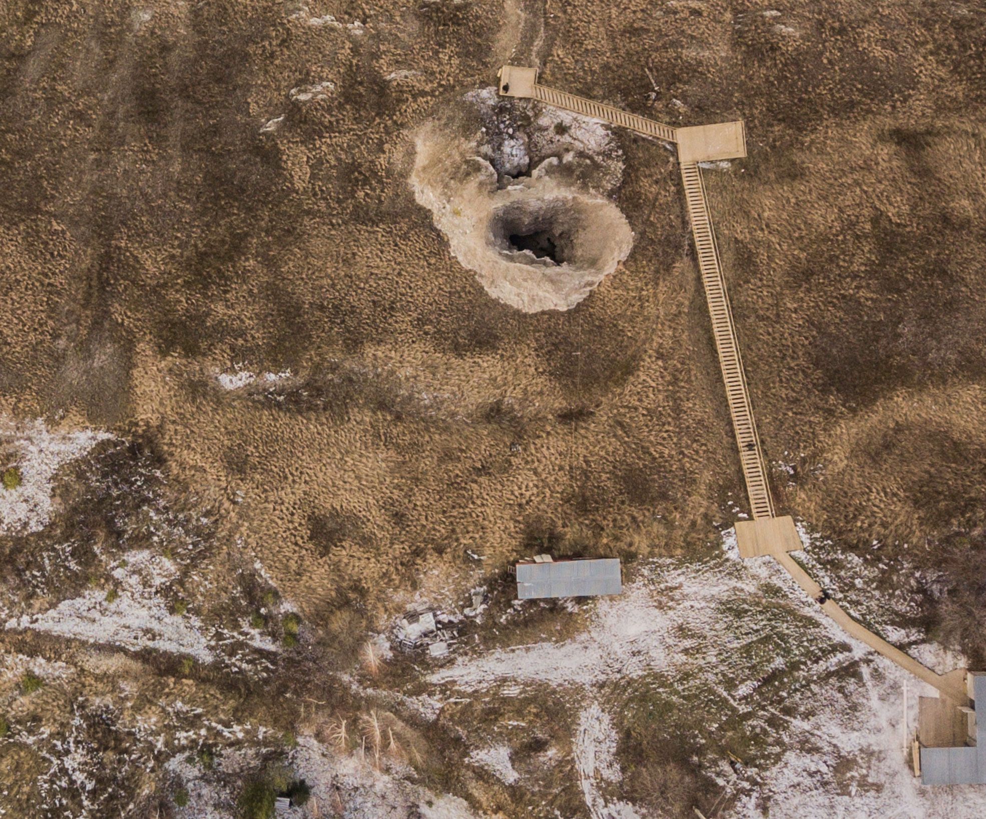 Ausrüstung wird auf der Plattform zusammenmontiert, von der Plattform führen die Metallstufen zum Teich hinunter.