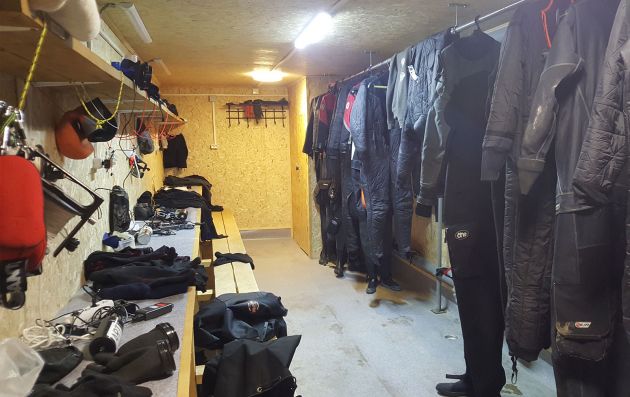 Raum für die Vorbereitung der Ausrüstung und des Ankleides, daneben beheizter Trocknerraum und Heizzentrale, alles geschlossen und bewacht. In der Basis stehen Twinsets (12l, 15l, 16l), Sidemount (12l, 16l), Steel Stage (12l) und Rebreathers zur Verfügung.